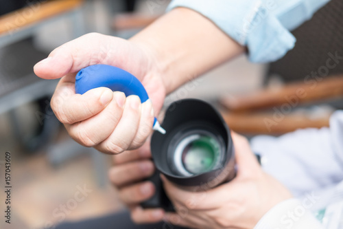 Close up of man hand cleaning camera with hand blower