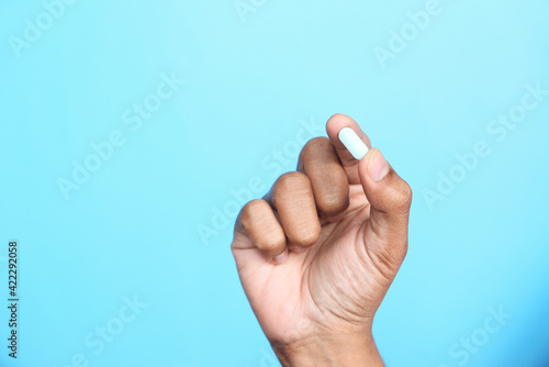 Close up of man hand holding pills with copy space