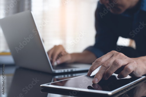 Close up of man hand using stylus pen on digital tablet working on laptop computer on table from home office