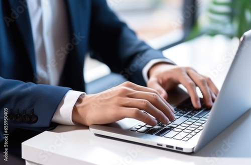 Close up of man hands typing text on laptop keyboard sitting at wooden table. Made with AI generation