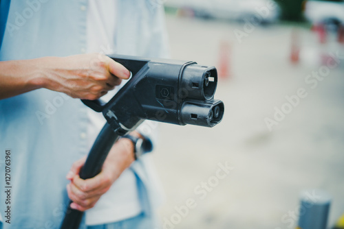 Close up of man holds electrical car cable charging with blur car parking at gas station. Eco, renewal energy concept.