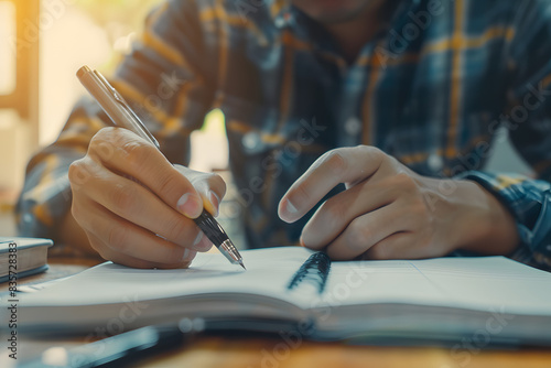 close up of man writing on a notebook