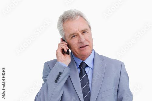 Close up of mature tradesman on his mobile phone