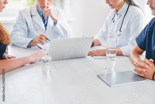 Close up of medical professional team meeting in clinic office