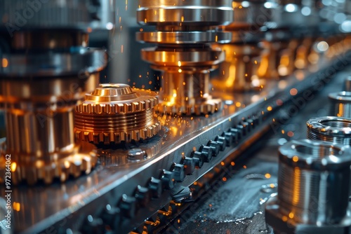 Close up of metal gear with blurred background showcasing industrial machine technology