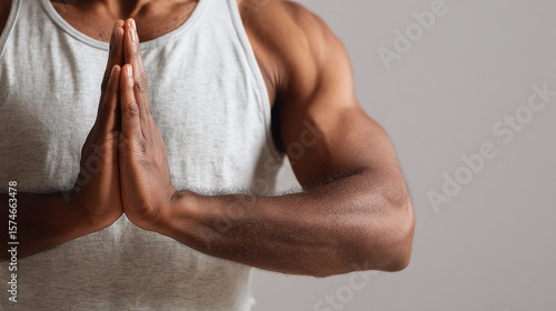 Close up of muscular man hands pressed together in prayer pose wearing sleeveless shirt with smooth skin and toned arm muscles