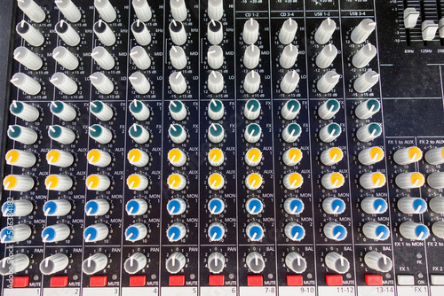 Close up of music equipment for sound mixer control, electronic device. DJ control panel