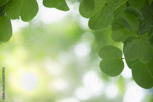 Close up of nature view green leaf on blurred greenery background under sunlight with bokeh and copy space using as background natural plants landscape, ecology wallpaper concept.