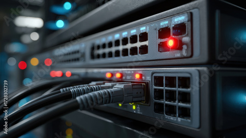 Close up of network switches with connected ethernet cables and glowing indicator lights in data center environment showing technology and connectivity