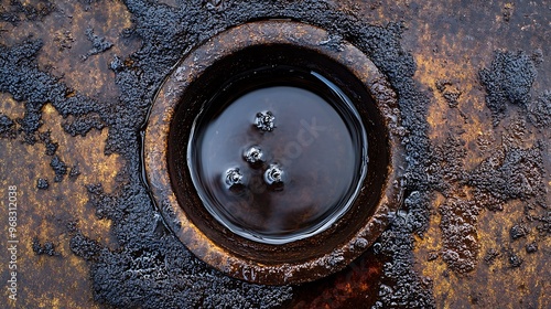 Close up of oil drain plug in rusty engine, revealing black oil, texture, and mechanics.