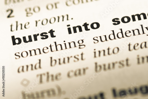 Close up of old English dictionary page with word burst into