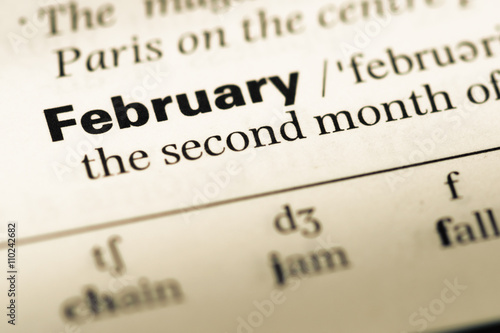 Close up of old English dictionary page with word February