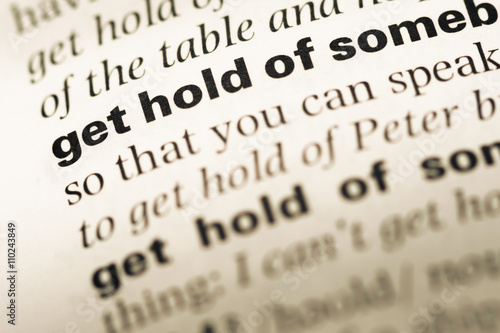 Close up of old English dictionary page with word get hold of