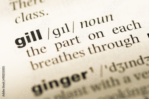 Close up of old English dictionary page with word gill