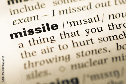 Close up of old English dictionary page with word missile