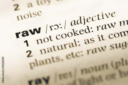 Close up of old English dictionary page with word raw