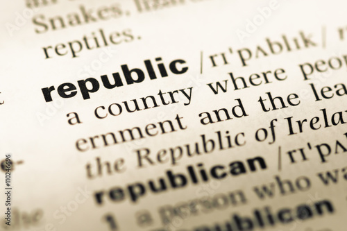 Close up of old English dictionary page with word republic