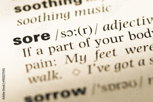 Close up of old English dictionary page with word sore