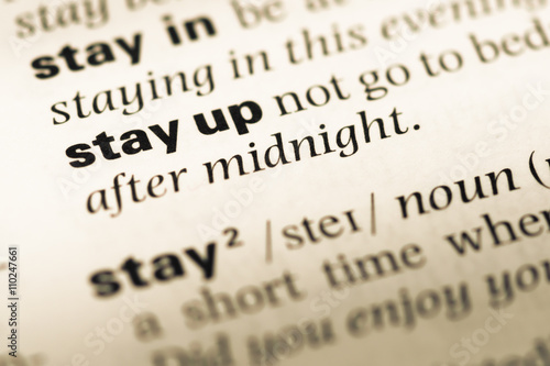 Close up of old English dictionary page with word stay up