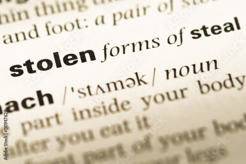 Close up of old English dictionary page with word stolen