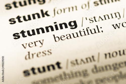 Close up of old English dictionary page with word stunning