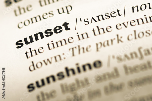 Close up of old English dictionary page with word sunset