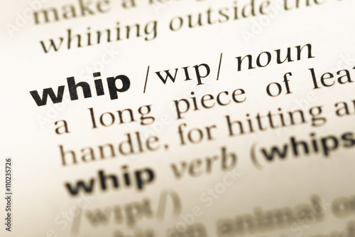 Close up of old English dictionary page with word whip
