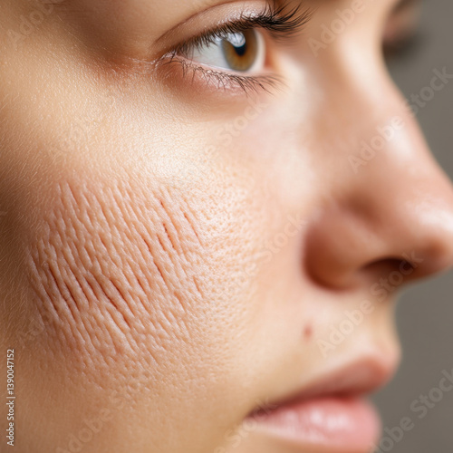 close up of person face showcasing skin details, including visible scars and texture. image captures natural beauty and imperfections of skin, evoking sense of vulnerability and authenticity