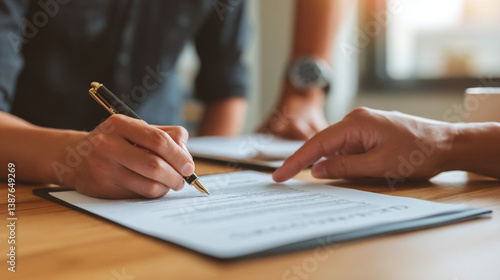 Close up of person signing document with pen while another person points at the paper on a wooden table