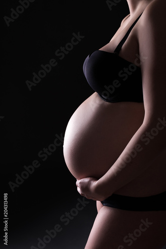 close up of pregnant belly over black