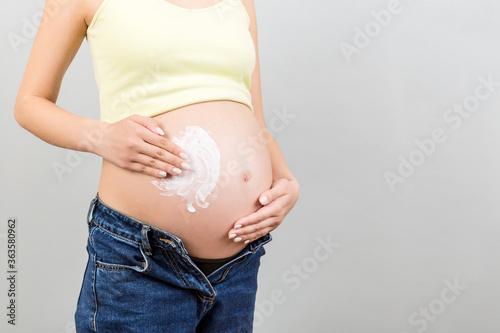 Close up of pregnant woman in opened jeans applying skin care cream on her belly to prevent stretch marks at colorful background with copy space. Healthy skin concept