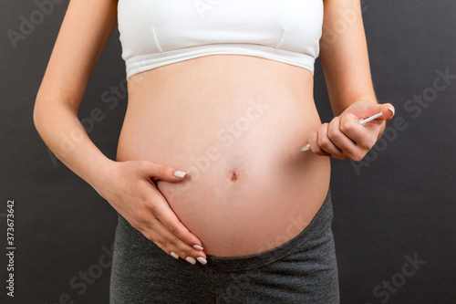 Close up of pregnant woman making injection of insulin in her belly at colorful background with copy space. Sugar control during pregnancy concept