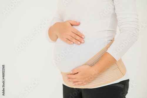 Close up of pregnant woman putting on a bandage at gray background with copy space. Orthopedic abdominal support belt concept.