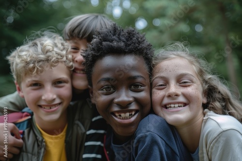 Close up of pre-teen friends in a park smiling to camera, Generative AI