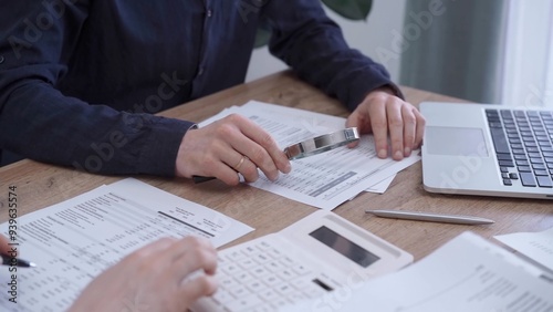 Close up of professional hands using a calculator to conduct financial analysis at the background of a colleague with a magnificent glass. Bookkeeping, finance audit and taxes