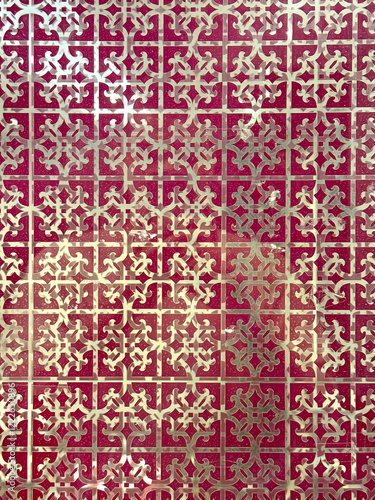 Close up of random red Chinese ornamental pattern sticker with layers on glass. Seamless background texture.