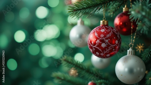 Close Up of Red and Silver Christmas Ornaments Hanging on a Tree with Bokeh Background
