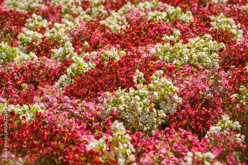 Close up of red, pink and white Begonia Semperflorens in flower bed.