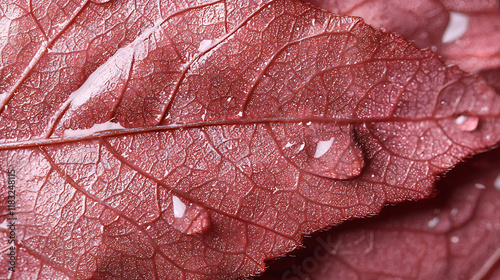 Close up of red plant leaves with water droplets, showcasing texture and detail