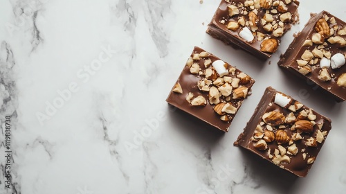 Close up of rich chocolate marshmallow fudge, topped with crushed nuts, isolated on a white marble background with minimal decor