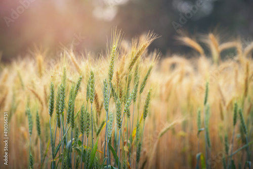 Close up of ripening ears of the green and yellow wheat field on the sunset cloudy orange sky background. Rural landscape of a ripening harvest at sunset