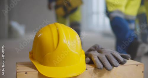 Close up of safety hardhat and gloves on wooden box