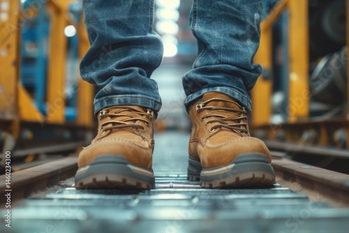 Close up of safety working shoe on worker feet standing in factory