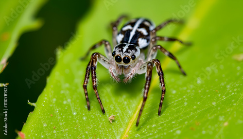 Close up of Salticid sciences or jumping spider Closeup of a strikingly beautiful green leaves background,