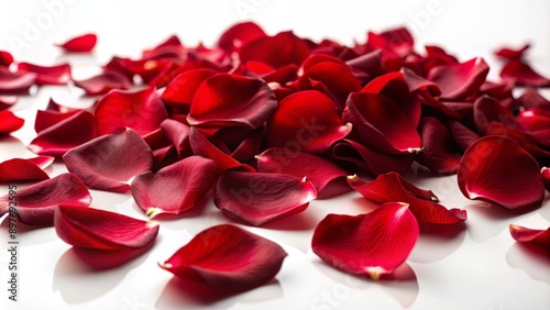 Close Up of Scattered Red Rose Petals, White Background, Macro Photography, Romantic, Valentines Day, Love, Romance