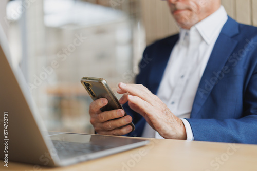 Close up of senior executive manager browsing internet on mobile phone while working on laptop computer at workplace, selective focus on hands holding cellphone