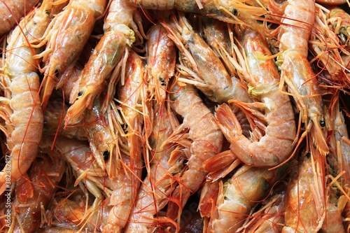 Close up of shrimps at fish market in the center of Athens in Greece.