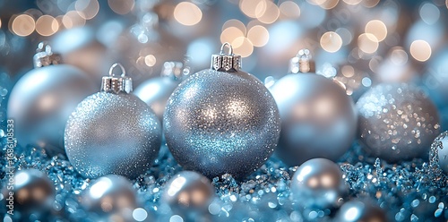 Close up of silver and blue Christmas ornaments with bokeh lights image