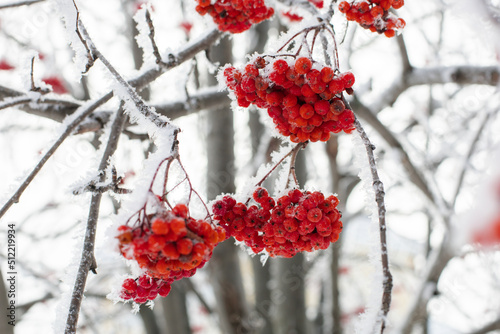 Close up of small thin branches of bright red rowan covered with snow with blurred trees in background in daytime. Gathering healthy berries in winter.