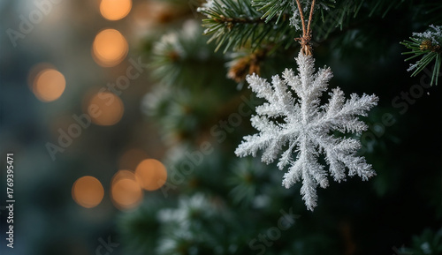 Close up of Snowflake hanging on Christmas tree with bokeh background